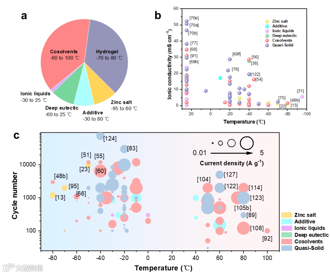 图2. a)全天候水系锌电池电解质的策略。b)不同温度下不同策略的离子电导率。c)全天候AZBs的不同策略的循环性能。(点的面积表示0.02至5Ag-1的电流密度。)