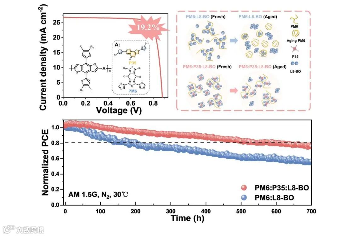 近日,来自南方科技大学的徐保民教授、王行柱教授以及湘潭大学的闫磊教授合作,在国际知名期刊Nano Energy上发表题为“Achieving stable organic solar cells with 19.2 % efficiency via fine interpenetrating network with fused-ring aromatic lactone donor”的观点文章。该观点文章本文通过引入新型聚合物供体 P35,利用其电子吸引能力和扩展分子平面,显著提升了有机太阳能电池的效率和长期稳定性。
