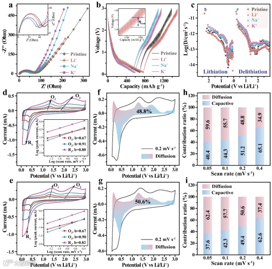 图4. Mo2CTxMXene电极的动力学分析。(a) EIS光谱,(b) GITT曲线。(c) 原始Mo2CTx和Li+/Na+/K+-Mo2CTx电极的Li+扩散系数。(d)原始Mo2CTx和(e)Li+-Mo2CTx电极从0.05至0.4 mV s-1扫描速率下的CV曲线(黑色、红色、蓝色和紫色线分别代表0.05、0.1、0.2和0.4 mV s-1),插图是CV曲线中氧化还原峰的log(i)- log(v)图。(f) 原始Mo2CTx电极和(g) Li+-Mo2CTx电极在2mV s-1下的扩散贡献。(h)原始Mo2CTx和(i) Li+-Mo2CTx电极不同扫描速率下扩散和电容控制过程的贡献。