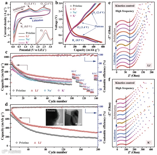 图5. Mo2CTxMXene电极的电化学性能表征。(a) 1mV s-1小的CV曲线,插入图显示了原始Mo2CTx和Li+-Mo2CTx电极在~1.35 V时放大的阳极峰。(b) GCD曲线。(c)原始Mo2CTx和Li+/Na+/K+-Mo2CTx电极的循环稳定性和速率能力。(d)原始Mo2CTx和Li+-Mo2CTx电极200次循环后的循环性能,插图为循环后的TEM图像。(e)Li+- Mo2CTx和(f) K+-Mo2CTx电极的原位EIS光谱。