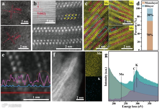 图2. M+-Mo2CTx的电镜表征。(a) Li+-Mo2CTx的HRTEM图像。(b) Li+-Mo2CTx的HAADF-STEM图像,插图为低放大倍率HAADF-STEM图像。(c) K+-Mo2CTx的HAADF-STEM图像,图像为伪彩色。(d)单层和双层K+预嵌入的相对百分比。(e) K+-Mo2CTx的HAADF-STEM图像和相应的EDS(线扫描)。紫色线和蓝色线分别代表Mo Lα和K Kα。(f) K+-Mo2CTx的HAADF-STEM图像和相应的EDS元素图。(g) K+-Mo2CTx的EELS谱。