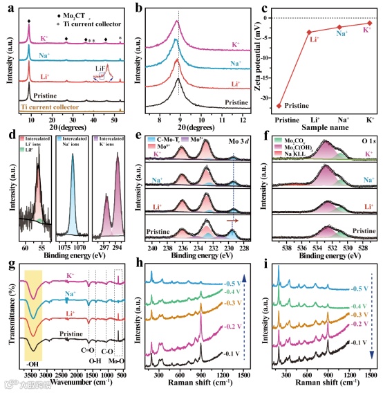 图3. Mo2CTx MXene的光谱表征。(a) Ti集流体、原始Mo2CTx和Li+/Na+/K+-Mo2CTx的XRD谱图。(b)放大(002)峰的XRD谱图。(c) Zeta电位。(d) Li+-Mo2CTx的高分辨率Li 1s (左),Na+-Mo2CTx的Na 1s (中),K+-Mo2CTx的K 2p(右)。(e)高分辨率Mo 3d。(f)高分辨率O 1s。(g) FTIR光谱。(h)Li+嵌入和(i) Li+脱嵌时Mo2CTx电极的原位拉曼光谱演变。