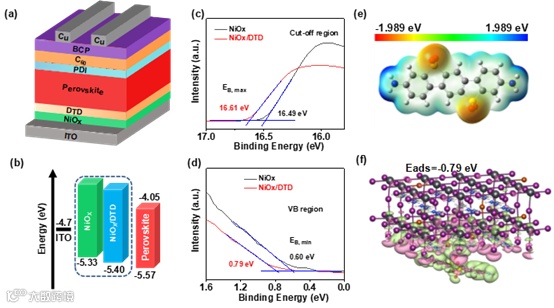 图1 (a) 器件结构;(b) 钙钛矿与经DTD修饰的NiOx之间能级分布;(c) and (d) NiOx修饰前后的UPS表征;(e) DTD分子的静电势;(f) DTD分子与钙钛矿之间电荷密度分布
