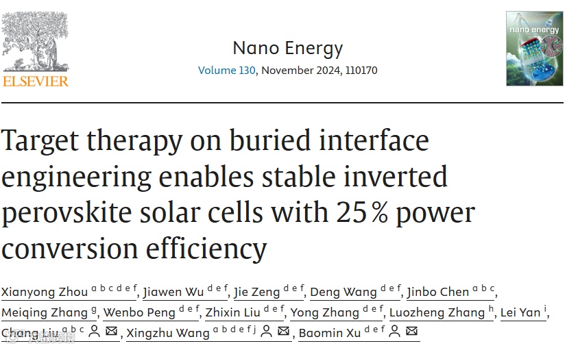 近日,南华大学刘畅教授、王行柱教授与南方科技大学徐保民教授合作,通过多功能分子对NiOx/钙钛矿埋底界面进行修复,实现效率为25.00 %的反式钙钛矿太阳能电池。相关工作以“Target therapy on buried interface engineering enables stable inverted perovskite solar cells with 25 % power conversion efficiency” 为题发表在国际知名期刊Nano Energy上。