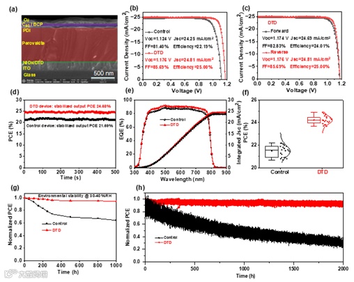 图5 器件的光伏性能:(a) 器件结构;(b) 不同器件J-V效率;(c) 器件的正反扫J-V曲线;(d) 器件稳态输出电流和效率;(e) EQE;(f) 效率统计分布;(g)器件的环境稳定性;(h)器件的长期运行稳定性