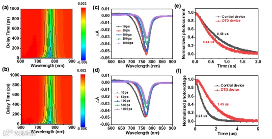 图4 钙钛矿薄膜和器件表征:(a)、 (b) 、(c)、 (d) fs-TA;(e) TPC;(f) TPV