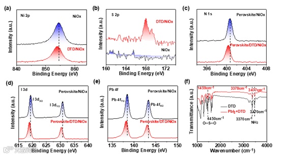 作者使用了一种多功能分子(DTD),将其应用到NiOx空穴传输层表面修饰,以改善NiOx形貌和功函数,并促进了NiOx和钙钛矿之间的相互作用,如图1所示。此外,理论计算结果表明DTD不仅可以可有效钝化钙钛矿中的埋底缺陷并调节钙钛矿晶体的生长。DTD分子中的多功能靶基团(多个氨基和亚砜基团)可以同时与NiOx中的镍离子和钙钛矿中的铅离子相互作用,如图2所示。这种双重效应促进了DTD分子在NiOx和钙钛矿之间的有序垂直排列,提高了空穴传输层中的空穴提取效率,并为钙钛矿的均匀成核提供了新的活性位点,这有利于抑制钙钛矿中的埋底缺陷和调节NiOx的能级。
