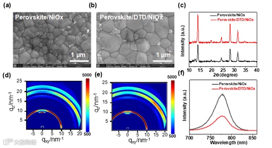 图3 钙钛矿薄膜的扫描电镜图:(a) Perovskite/NiOx;(b) Perovskite/DTD/NiOx;(c) XRD;(d) and (e) GIWAXS; (f)PL