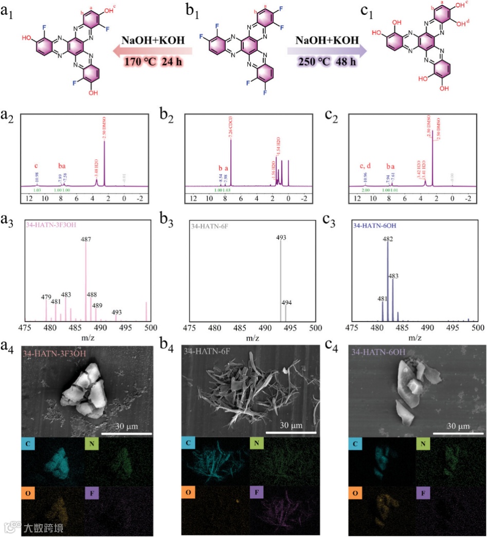 图1. a1-c1) 34-HATN-3F3OH、34-HATN-6F 和 34-HATN-6OH 的分子结构、a2-c2) 1H NMR 光谱、a3-c3) 质谱以及 (a4-c4) SEM 图像和 EDS 图谱。
