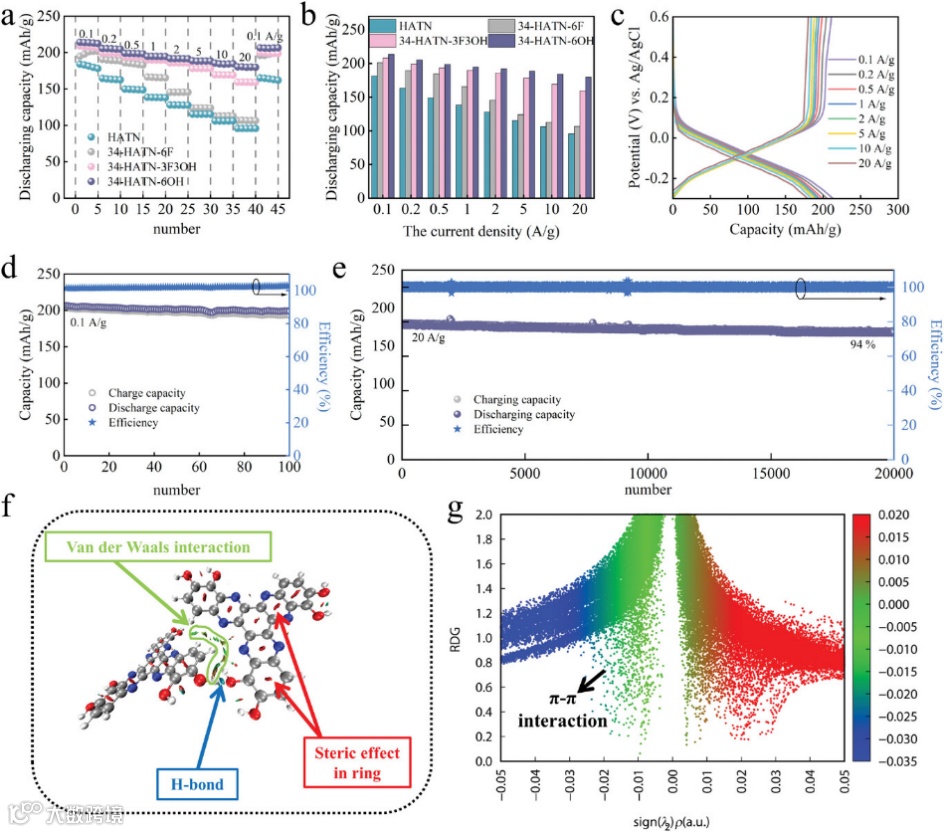 图3. a) HATN、34-HATN-6F、34-HATN-3F3OH 和 34-HATN-6OH 电极在 0.1 至 20 A g-1 电流密度下的倍率性能和 b) 容量。34-HATN-6OH 的c)充放电曲线,d) 1 A g-1 时的循环性能, e)在 20 A g-1 时的长期循环稳定性。34-HATN-6OH 的f) 还原密度梯度 (RDG) 等值面示意图, g) RDG 与 sign(λ2)ρ 散射图。