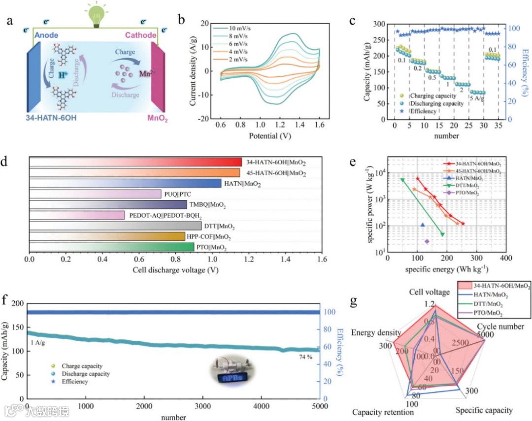 a) MnO2||34-HATN-6OH质子电池的示意图和工作机制。b) 不同电流密度下的 CV 曲线。c)倍率性能。d)有机电极材料在酸性电解质中的电池放电电压比较。e) MnO2||34-HATN-6OH 电池的能量密度和功率密度与其他储能系统的比较。f) 电流密度为 1 A g-1 时的循环寿命。g) 全面的性能评估,包括电池电压、能量密度、循环次数、比容量和容量保持率。