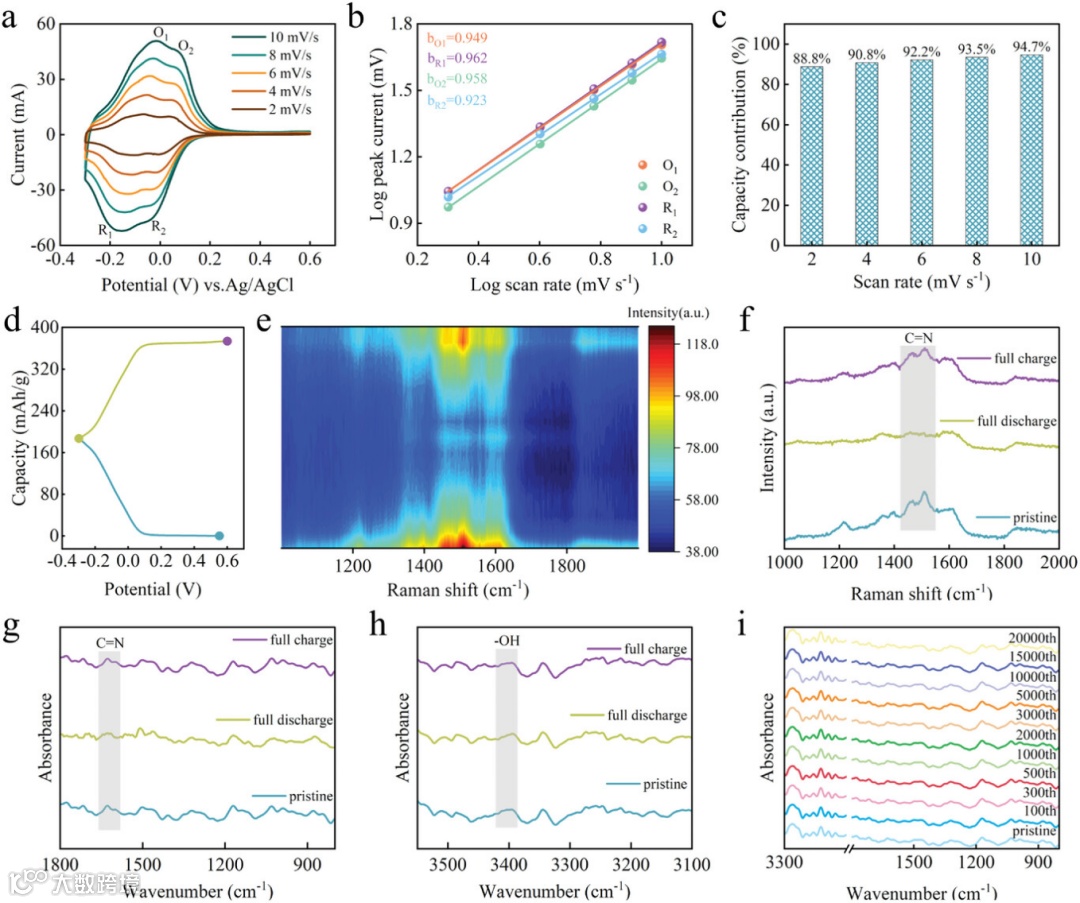 图4. a) 34-HATN-6OH 在 2 至 10 mV s-1 不同扫描速率下的 CV 曲线。b) 利用 34-HATN-6OH 在不同扫描速率下的 CV 曲线中的相应峰值电流绘制的对数(峰值电流,mA)与对数(扫描速率,mV s-1)图。d-f) 34-HATN-6OH 电极在放电/充电过程中的原位拉曼光谱。g,h) 34-HATN-6OH 在原始状态、完全放电和完全充电时的非原位傅立叶变换红外光谱。