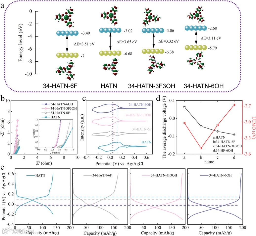 图2. HATN、34-HATN-6F、34-HATN-3F3OH 和 34-HATN-6OH a) HOMO/LUMO 能级和能隙 (ΔE),b) EIS,c) CV 曲线,d) 计算出的前沿分子轨道能量和平均放电电压(黑点代表平均放电电压,圆点代表 LUMO 能量),e)在 1 A g-1 电流密度下的 GCD 曲线。