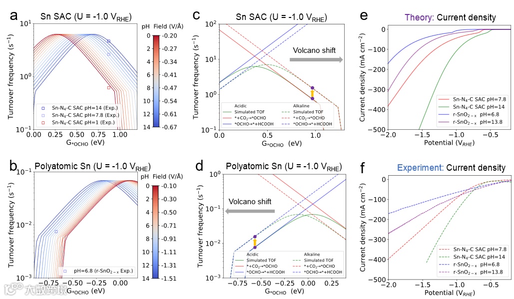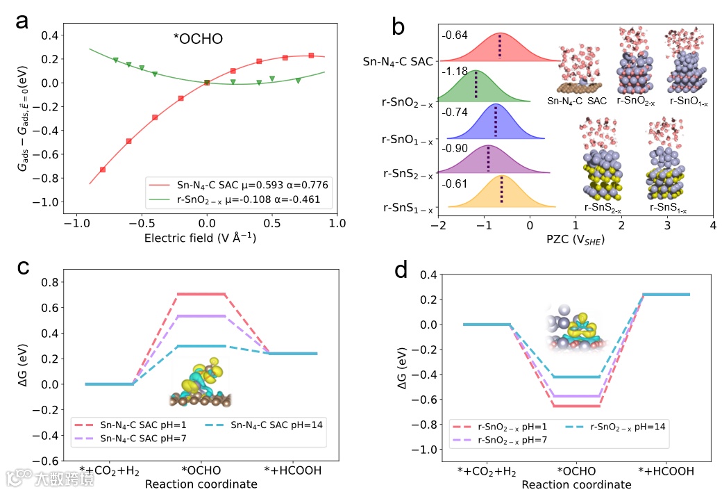 研究表明,单原子Sn上正偶极矩使 *OCHO在负电场中更稳定,而多原子Sn(重构的SnO2)体系表现出相反趋势。进一步通过显式溶剂模型精准评估了Sn基催化剂的零电荷电势的值,为了后续pH依赖的动力学模拟做铺垫。
