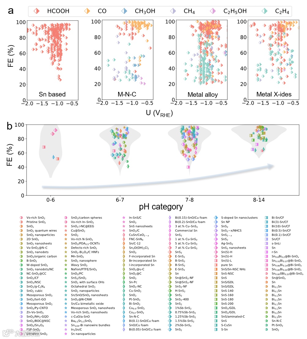 通过对2,348种已报道催化剂的CO2还原性能数据进行大规模挖掘 (所有实验数据均已储存于作者团队开发的DigCat数据库),本研究系统分析了不同催化剂类型的主要产物法拉第效率(FE)。其中,Sn基催化剂在形成甲酸方面表现出显著的活性和pH依赖性。