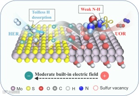 构建内置电场是优化反应中间体吸附、反应和脱附的有效策略,但其精确调控以实现高效双功能电催化反应仍极具挑战。基于此,郑州轻工业大学魏世忠教授、巩飞龙副教授联合内蒙古大学刘健教授团队合作在Advanced Materials期刊发表题为“Hollow Mo/MoSVn Nanoreactors with Tunable Built-in Electric Fields for Sustainable Hydrogen Production”的研究论文,通过精准调制钼基同源异质结材料的阴离子空位,构筑了具有可调内置电场的中空Mo/MoSVn纳米反应器,优化了析氢反应(HER)过程中氢解吸和尿素氧化反应(UOR)过程中N–H键能,提升了析氢反应和尿素氧化反应,实现了尿素耦合节能制氢。
