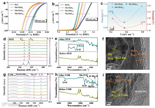 图4. Mo/MoSVn电催化性能及表征。a)HER和b)UOR的LSV曲线。c)BIEF与HER和UOR活性(过电位和他菲尔斜率)关系图。d)HER过程中不同电压下拉曼光谱对比图,e)HER前后红外光谱对比图,以及f)HER后HRTEM图像。g)UOR过程中不同电压下拉曼光谱对比图,h)UOR前后红外光谱对比图,以及i)UOR后HRTEM图像。