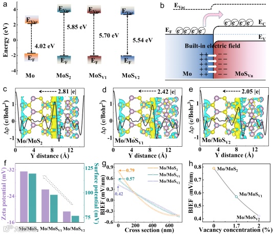 图3. BIEFs分析。a)Mo和Mo/MoSVn功函数。b)界面BIEF示意图。c-e)平面平均电荷密度差,插图是相应的EDDs。f)Zeta电位和表面电位对比图。g)界面电场强度对比图。h)硫空位浓度与BIEF强度的关系图。
