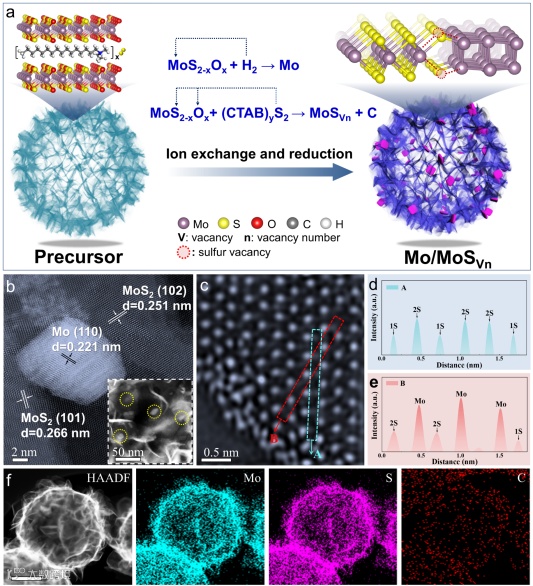 通过调节水油两相反应过程中的硫源添加量,预先制备由MoS2-xOx和不同量(CTAB)yS2组成的前驱体,随后通过一步阴离子交换和氢气还原转化为Mo/MoSVn(图1a)。低倍率球差校正透射电子显微镜(AC-TEM)图像显示Mo纳米颗粒均匀分散在纳米片组装的中空MoS2载体上(图1b)。高倍率AC-TEM图像直观证实了Mo/MoSV1中存在硫空位(图1c-e)。高角度环形暗场(HAADF)和相应的元素面分析图揭示了Mo、S和C元素的均匀分布(图1f)。