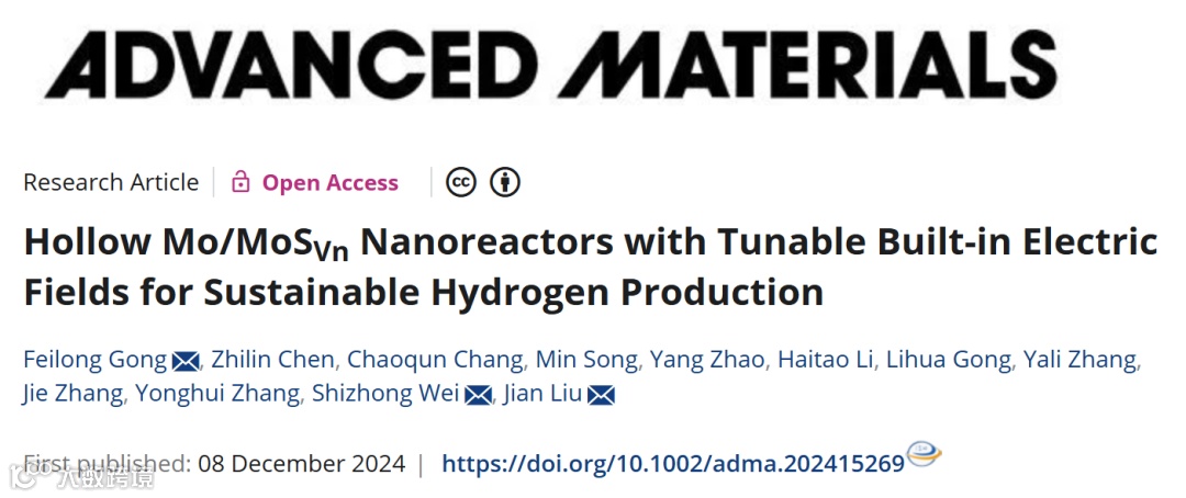 Feilong Gong,* Zhilin Chen, Chaoqun Chang, Min Song, Yang Zhao, Haitao Li, Lihua Gong, Yali Zhang, Jie Zhang, Yonghui Zhang, Shizhong Wei,* and Jian Liu*. Hollow Mo/MoSVn Nanoreactors with Tunable Built-in Electric Fields for Sustainable Hydrogen Production. Advanced Materials. 2024. DOI: 10.1002/adma.202415269
