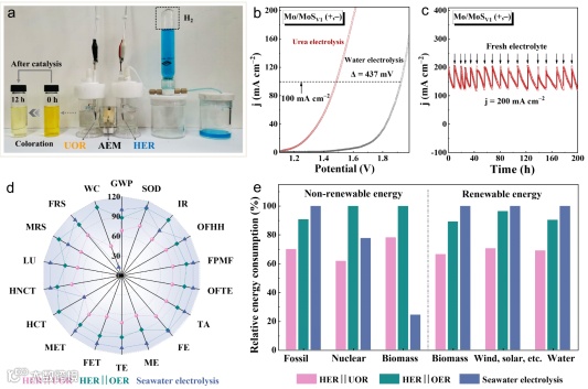 利用中空Mo/MoSV1纳米反应器作为阳极和阴极(图6a),组装的HER||UOR耦合制氢系统比常规HER||OER电解电位低437 mV(100 mA cm-2)(图6b)。与报道的尿素辅助电解水制氢催化剂相比,Mo/MoSV1在低电流和高电流密度下均表现出更高活性。从计时安培测试结果可以看出,周期性的添加电解质,尿素耦合制氢活性可恢复到初始水平,证实了催化剂的耐久性(200 mA cm-2,图6c)。不同电解时间的尿素显色结果表明,经过12小时电解反应,溶液颜色从深黄色变为近乎无色,尿素平均降解率为90.06%。对HER||UOR、HER||OER和海水电解制氢技术进行了生命周期评价,研究了三种技术对多种环境因素的影响。