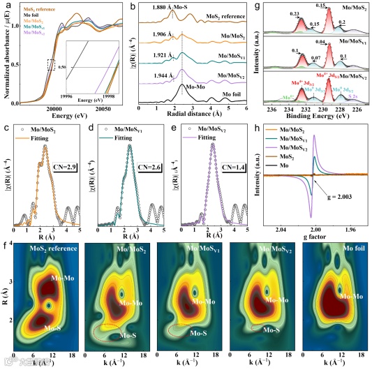 图2. Mo/MoSVn纳米反应器的化学状态和电子结构信息。a)Mo K-edge的XANES光谱。b)FT-EXAFS光谱。c-e)Mo在R空间的EXAFS拟合曲线。f)MoS2参比、Mo/MoSVn和Mo箔的k3加权Mo K 边 EXAFS相应WT。g)Mo 3d高分辨率XPS光谱对比。h)EPR光谱对比。