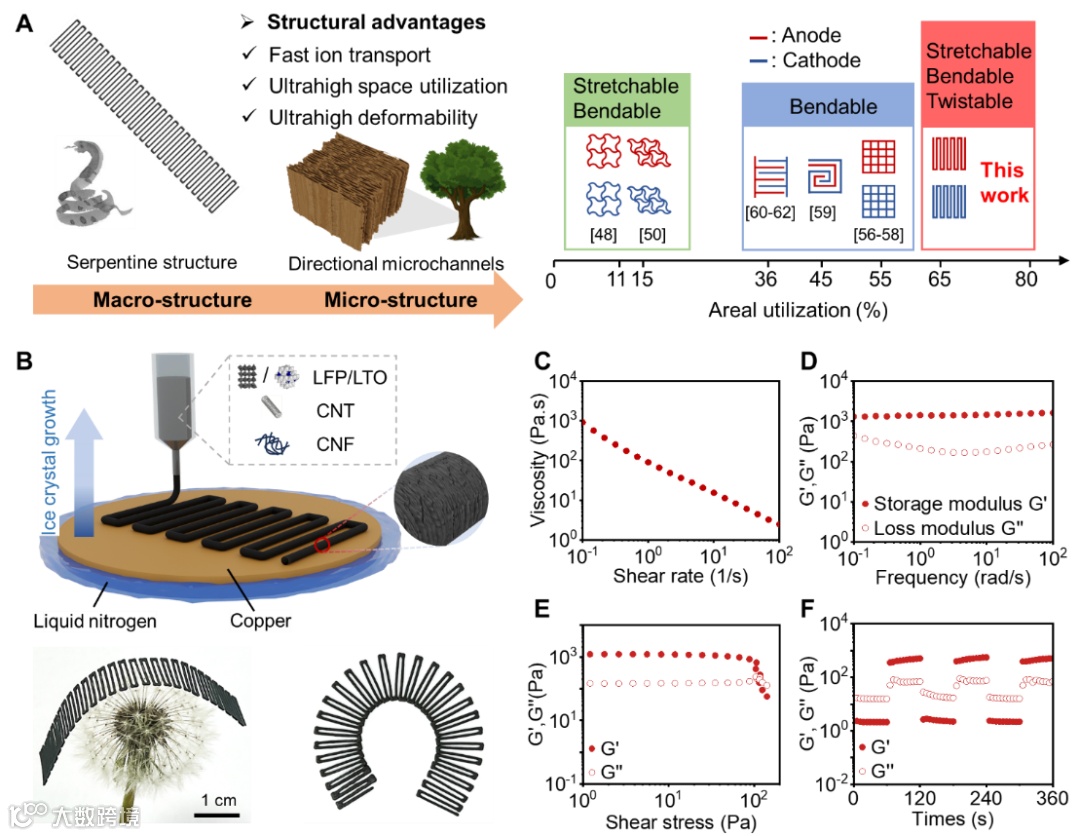 图1:多尺度仿生结构电极的设计与制造以及3D打印墨水的流变特性。
