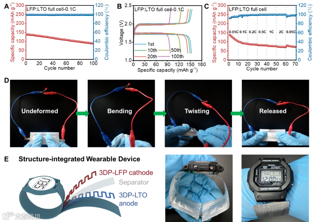 图6:3D打印全电池的电池性能及应用展示。