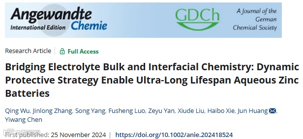 贵州大学黄俊、南昌大学陈义旺团队合作在Angewandte Chemie International Edition期刊发表题为“Bridging Electrolyte Bulk and Interfacial Chemistry: Dynamic Protective Strategy Enable Ultra-Long Lifespan Aqueous Zinc Batteries”的研究论文。该研究利用甲壳素纳米晶体(ChNCs)的物理和化学协同效应,将其作为优异的胶体电解质,在电解质主体与界面化学之间架起桥梁,从而实现超长寿命的水系锌电池。