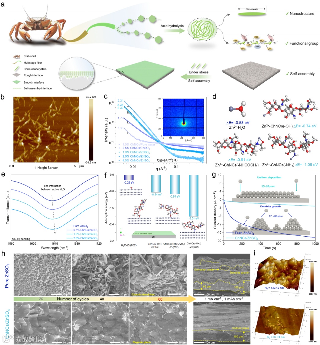 图1. ChNCs和ChNCs/ZnSO₄胶体电解质的表征。(a)ChNCs的制备与特性示意图。(b)ChNCs的原子力显微镜(AFM)图像。(c)小角X射线散射测试(SAXS)。(d)ChNCs中-OH、-NHCOCH₃和-NH₂基团与Zn²⁺的结合能(灰、红、白、蓝和银分别代表C、O、H、N和Zn²⁺)。(e)含不同比例ChNCs的ZnSO₄电解质的傅里叶变换红外光谱(FTIR)。(f)ChNCs中-OH、-NHCOCH₃和-NH₂基团在Zn(002)表面的吸附能。(g)不同电解质的计时电流测试曲线。(h)不同循环圈数下的锌负极表面的扫描电子显微镜(SEM)图像。(i)采用不同电解质循环后锌负极表面的原子力显微镜(AFM)图像。