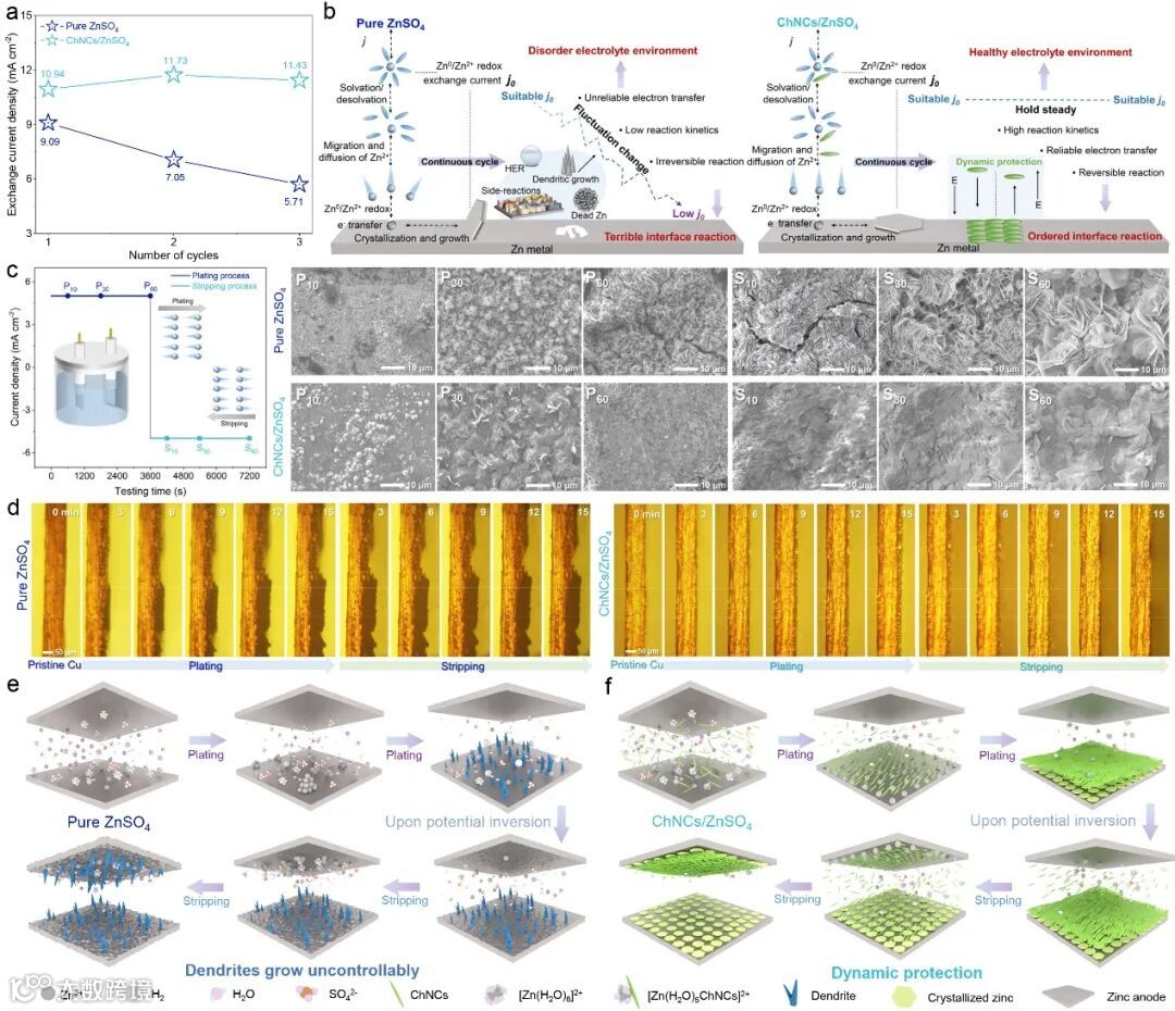 图3. ChNCs/ZnSO₄胶体电解质动态保护策略的研究。(a)循环过程中交换电流密度(j₀)的演化。(b)电池系统中j₀变化在桥接电解质主体和界面化学之间优化的示意图。(c)在电解池中对称锌电极镀锌/脱锌的测试方案及其在不同镀锌/脱锌时间下同一锌电极表面的扫描电子显微镜(SEM)图像(P10-60和S10-60分别表示镀锌和脱锌10至60分钟)。(d)在10 mA cm⁻²和2.5 mAh cm⁻²条件下,不同电解质中铜箔上锌沉积和剥离过程的原位光学显微镜图像。(e,f)ChNCs在桥接电解质主体和界面化学之间的动态保护机制示意图。
