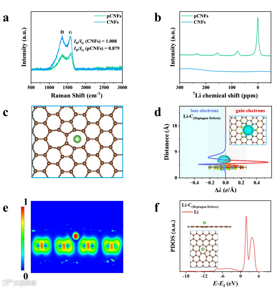 密度泛函理论(DFT)计算揭示锂优先吸附在CNFs的五边形和七边形缺陷位点,这些位点的负电荷更有利于Li+的吸附(图4)。计算结果与实验观察一致,表明锂主要分布于缺陷位点,并具有准金属特性,解释了锂在pCNFs中的复杂存在形式。