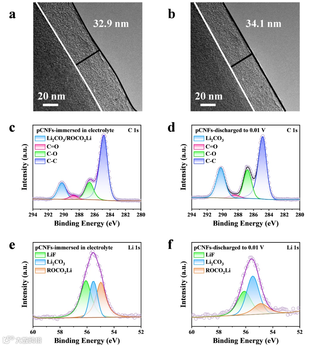 图6通过XPS分析了pCNFs表面生成的SEI膜。预锂化使SEI膜中LiF和Li2CO3的含量增加,增强了SEI膜的机械强度和锂离子传输能力。相比未处理的CNFs,pCNFs在SEI膜上形成的富含LiF和Li2CO3的膜层均匀且稳定,有效抑制了副反应的发生,显著提高了电池的循环寿命。