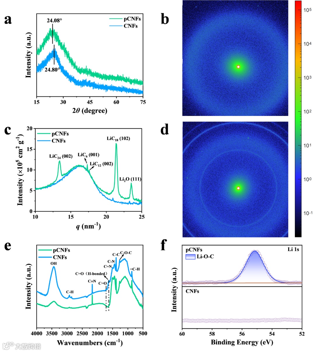 通过SEM和HRTEM图像(图2),观察到pCNFs表面被颗粒覆盖,表层厚度增加,形成更致密的膜层。X射线衍射(XRD)与广角X射线散射(WAXS)分析表明,预锂化后pCNFs的层间距增大,并形成了LiC24和LiC18等锂石墨插层化合物。此外,拉曼光谱显示,pCNFs的缺陷程度下降,预锂化时锂填补了缺陷位点,有效提高材料的结构稳定性。