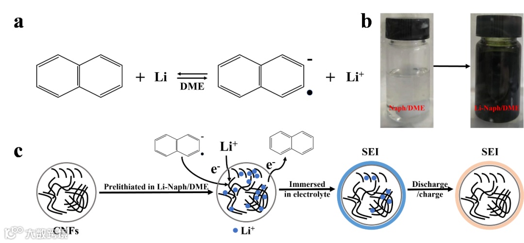 图1展示了Li-Naph的合成过程及CNFs的化学预锂化反应过程。在Li-Naph/DME溶液中,锂通过电子转移生成带负电荷的萘自由基离子,与CNFs反应形成初步的SEI膜。经过5分钟的预锂化后,pCNFs的初始库仑效率(ICE)由76.1%提升至93.89%,比未处理的CNFs有显著提高。