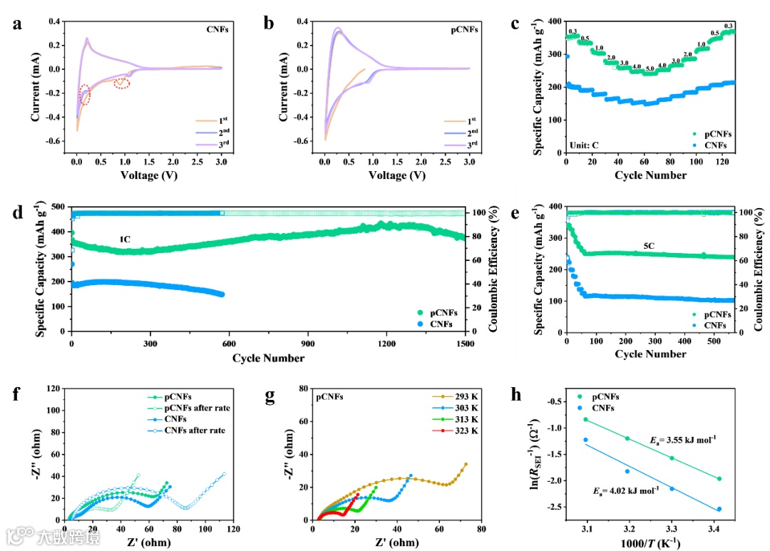 图5显示了pCNFs显著提高的倍率性能和循环稳定性。与未处理的CNFs相比,pCNFs的容量保持率更高,500次循环后容量保留率达到95.88%。电化学阻抗谱(EIS)显示,pCNFs的SEI膜在多次循环后依然稳定,阻抗下降,表明该预锂化策略改善了锂离子传输路径。