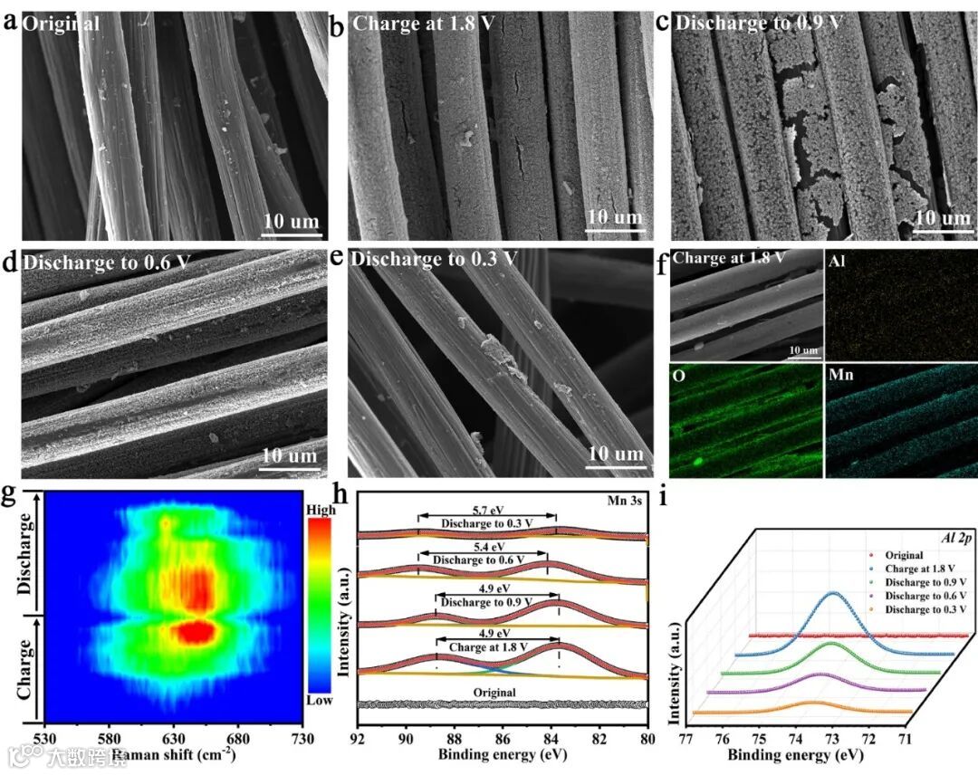 (a-e) 不同充放电态下碳布的SEM图,(f) 充电态下碳布的EDS图,(g) 原位拉曼光谱,(h)Mn 3s和(i) Al 2p XPS谱。
