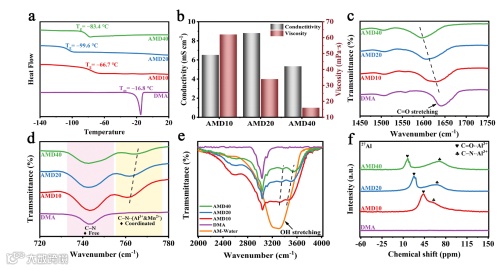 (a) DSC曲线,(b) 不同摩尔比下HEEs的电导率和粘度,(c-e) FTIR光谱,(f) 27Al NMR谱。