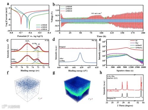 (a) Tafel曲线,(b) Al||Al对称电池循环曲线,循环前后Al表面的(c) Al 2p和(d) Mn 2p XPS谱, (e) TOF-SIMS深度曲线, (f) Mn-和(g) Al-的三维图像,(h) 循环前后Ti基底的XRD图。