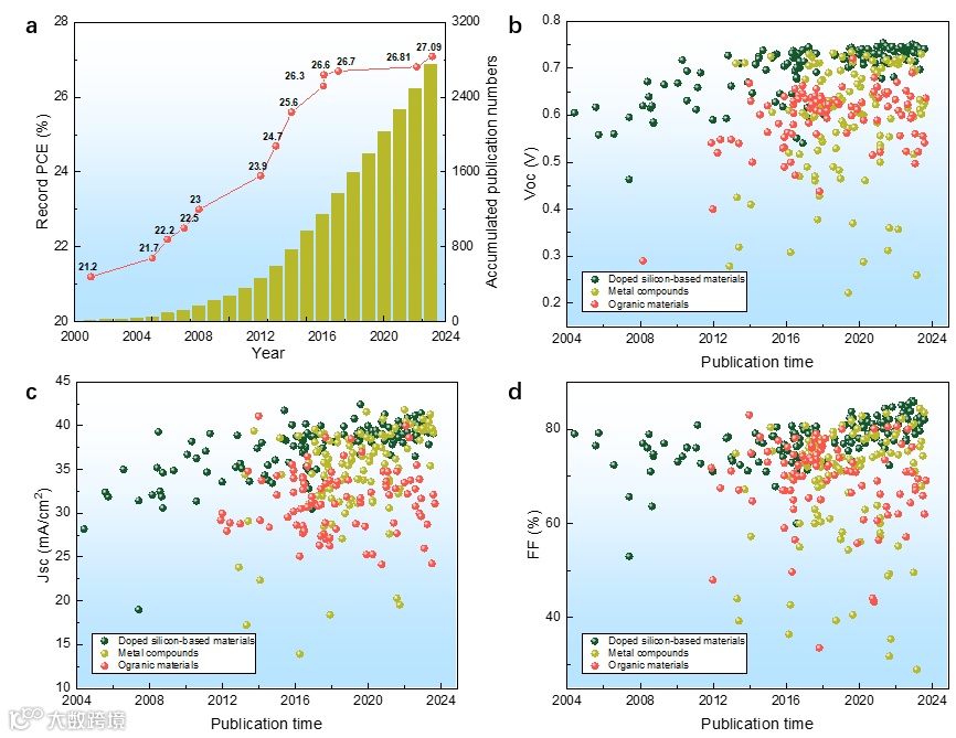 图表 1 a) 2000-2024年间异质结(HJT)太阳能电池最高光电转换效率(PCE)记录的提升情况及累积发表论文数量。论文数量数据来源于Scopus(www.scopus.com)。选择性钝化接触在HJT太阳能电池中按掺杂硅基材料、金属化合物和有机材料分类的进展情况,分别体现在b) 开路电压(Voc),c) 短路电流密度(Jsc),以及d) 填充因子(FF)数值。
