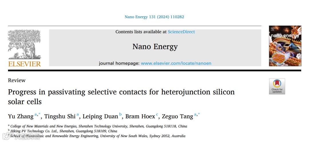 近日,深圳技术大学张瑜老师与唐泽国老师团队在国际知名期刊《Nano Energy》上发表了一篇题为《硅异质结太阳能电池中选择性钝化接触的最新进展》的权威综述论文。这项研究全面回顾了过去十年间异质结太阳能电池领域的重要技术突破,特别是选择性钝化接触技术的创新,为推动硅基太阳能电池的效率提升和稳定性增强提供了重要支持。