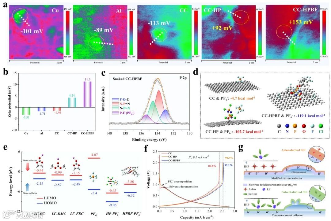 电极界面IHP结构对SEI膜的形成具有重要作用,本论文创新性地提出采用阴离子-π相互作用,诱导形成富含阴离子的IHP和高稳定性的SEI膜。首先,将不同Qzz值的有机分子,采用“亲核取代反应”对碳布和铜箔集流体进行表面修饰,改性集流体表面性质和双电层结构得到明显改变(图2)。KPFM和Zeta电位测试表明,具有较高Qzz值(+35.1)分子改性的CC-HPBF集流体表面电势显著提升并有效吸附PF6-阴离子。结合荧光/紫外光谱和理论计算,CC-HPBF通过阴离子-π相互作用对多种类型的阴离子(PF6-、BF4-、NO3-等)具有吸附作用。