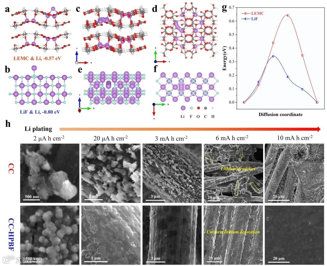 由于阴离子-π作用导致电极双电层及SEI膜结构的改变,这会进一步影响电极界面离子传输动力学过程与锂沉积行为。DFT结果表明,相对于有机LEMC,SEI膜中的LiF无机组分具有更强的锂离子结合能及更低的锂离子传输能垒(图5)。因此,改性CC-HPBF集流体具有结构均一、致密、无枝晶的锂沉积形貌。