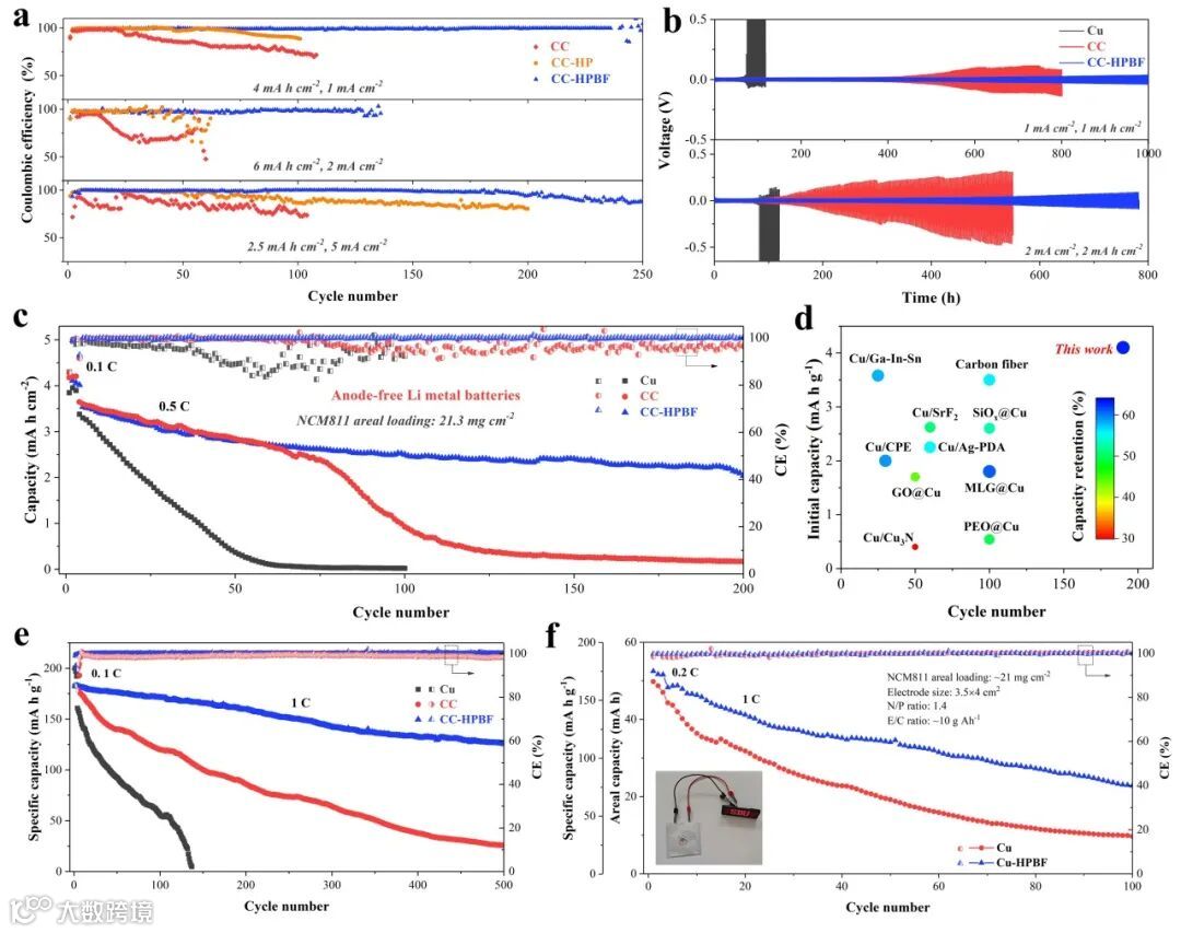 图6. 不同集流体的锂剥离/沉积效率与全电池电化学性能