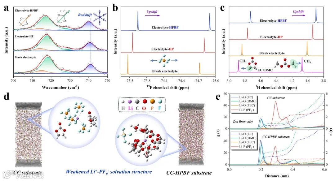 结合Raman/NMR测试和理论计算,缺电子性较强的HPBF和PF6-阴离子具有较强的阴离子-π相互作用,这会削弱Li+与PF6-之间的配位作用,有利于PF6-在电极界面发生还原反应并形成富含LiF的SEI膜(图3)。此外,多种试验测试和理论计算表明,HPBF与电解液中的阳离子(Li+、TBA+等)和溶剂分子(EC、DMC、FEC等)基本无相互作用,阴离子-π相互作用对电解液溶剂化结构的影响起到主导作用。