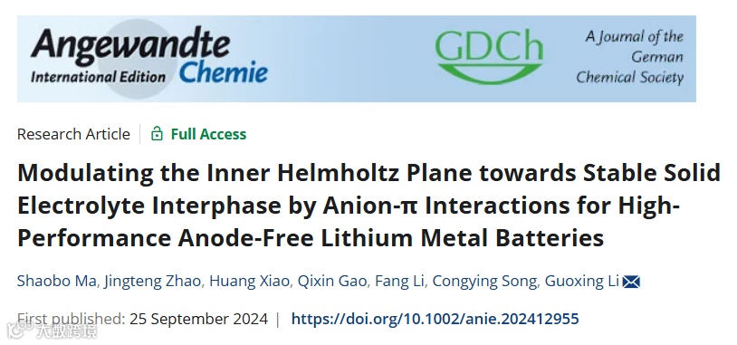 Modulating the Inner Helmholtz Plane towards Stable Solid Electrolyte Interphase by Anion- Interactions for High-Performance Anode-Free Lithium Metal Batteries, Angewandte Chemie International Edition, 2024, 10.1002/anie.202412955.