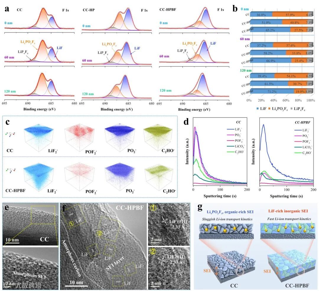 由于阴离子-π相互作用导致IHP中阴离子含量增加并促进电解液脱溶剂化过程,这会进一步诱发阴离子衍生SEI膜的生成。刻蚀XPS及TOF-SIMS结果表明,循环后的CC-HPBF集流体主要生成富含LiF的无机SEI膜,具有较高的离子电导率及机械强度,且由外至内LiF含量逐渐递增(图4)。HR-TEM进一步证明,CC-HPBF的SEI膜含有丰富的LiF(111)晶格条纹,而对比样(CC)更易生成无定形结构、有机组分为主的SEI膜。