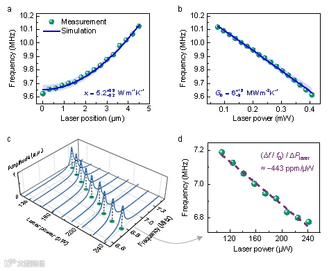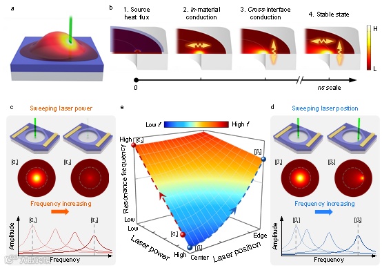 研究人员选择β-In2S3这一典型的二维非层状材料(非层状指在三个晶轴方向上均由共价键键合),将其制成NEMS鼓膜式谐振器,利用器件动态响应考察纳米片上的热输运过程。通过将用于观测振动的激光束同时用于器件加热,研究人员巧妙地调控了激光功率和位置这两个自由度,从而实现了对NEMS器件热稳态和与之相关的器件频域响应的高效调谐。