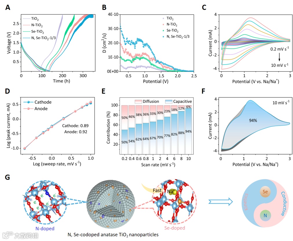 恒电流间歇滴定(GITT)实验测试表明,与未掺杂,单掺杂和N, Se双掺杂TiO2相比,N, Se-TiO2-1/3样品具有较大的钠离子扩散系数(3.3×10−10~4.0×10−12 cm2 s−1),表明其具有快速充放电的潜能。另外,随着扫速的增加,赝电容贡献在10 mV s-1下高达94%,赝电容行为增强说明Na+能够快速扩散到双掺杂TiO2材料中。