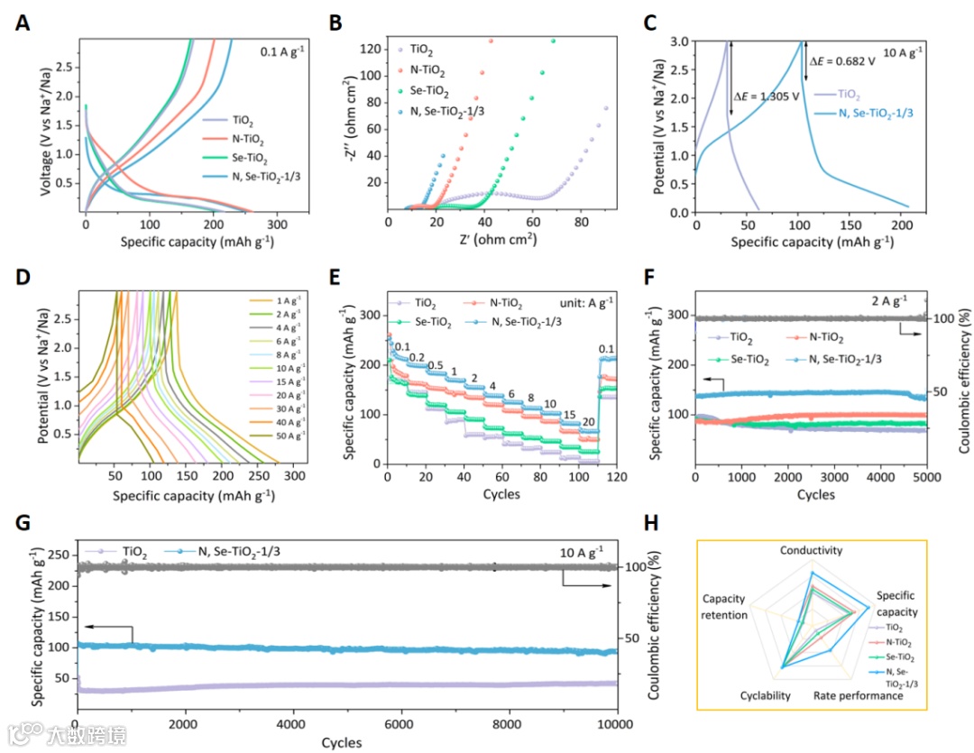 与未掺杂的TiO2以及N和Se单掺杂的TiO2电极相比,N和Se双掺杂TiO2电极的阻抗较小,表明N和Se双掺杂能够改善钠离子传输路径。在测定电流密度下,N和Se共掺杂TiO2电极的容量均高于其它电极。在电流密度为2A g-1时,循环5000次后容量保持率高达97%。特别是N和Se掺杂原子百分比为1:3(N, Se-TiO2-1/3)显著提高了TiO2的倍率性能和循环稳定性。